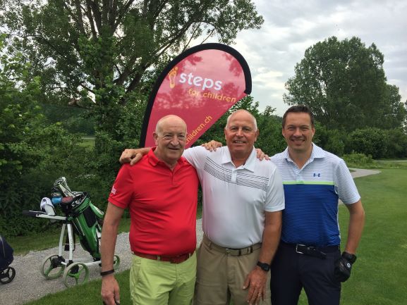 Stiftungsratsmitglied Guy Loretan eröffnet mit seinen Flight-Partnern das Turnier – Guy Loretan überreicht Turniersiegerin Andrea Luder die „steps for children Golf-Trophy“ – Golfbegeisterte Teilnehmer*innen